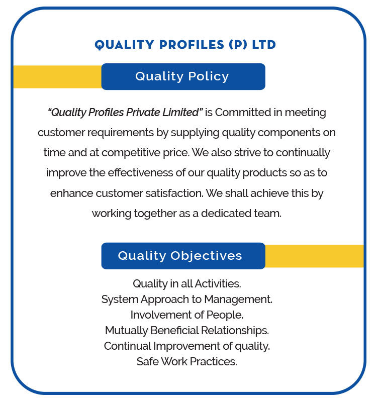 “Quality Profiles Private Limited” is Committed in meeting customer requirements by supplying quality components on time and at competitive price. We also strive to continually improve the effectiveness of our quality products so as to enhance customer satisfaction. We shall achieve this by working together as a dedicated team.